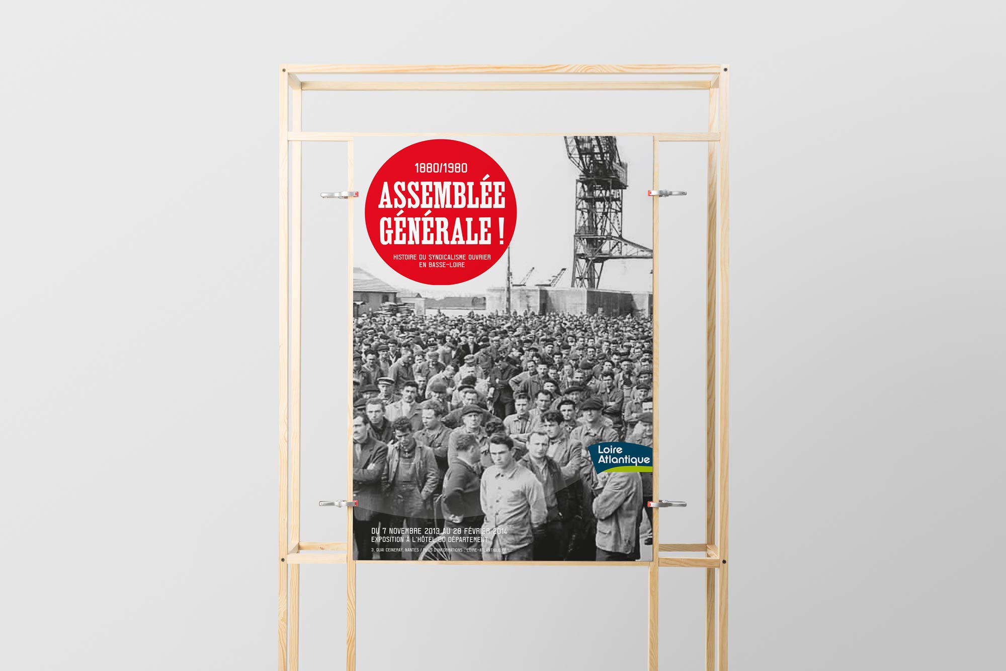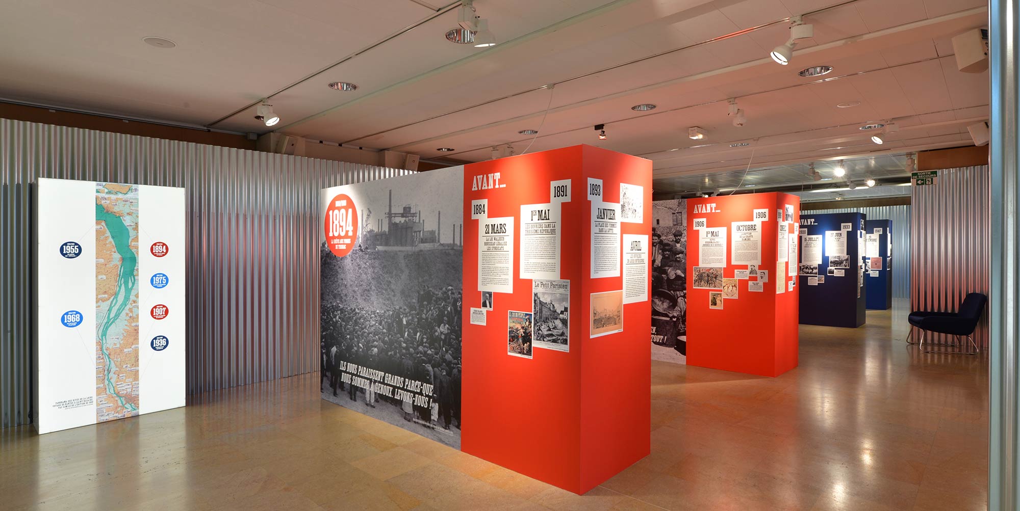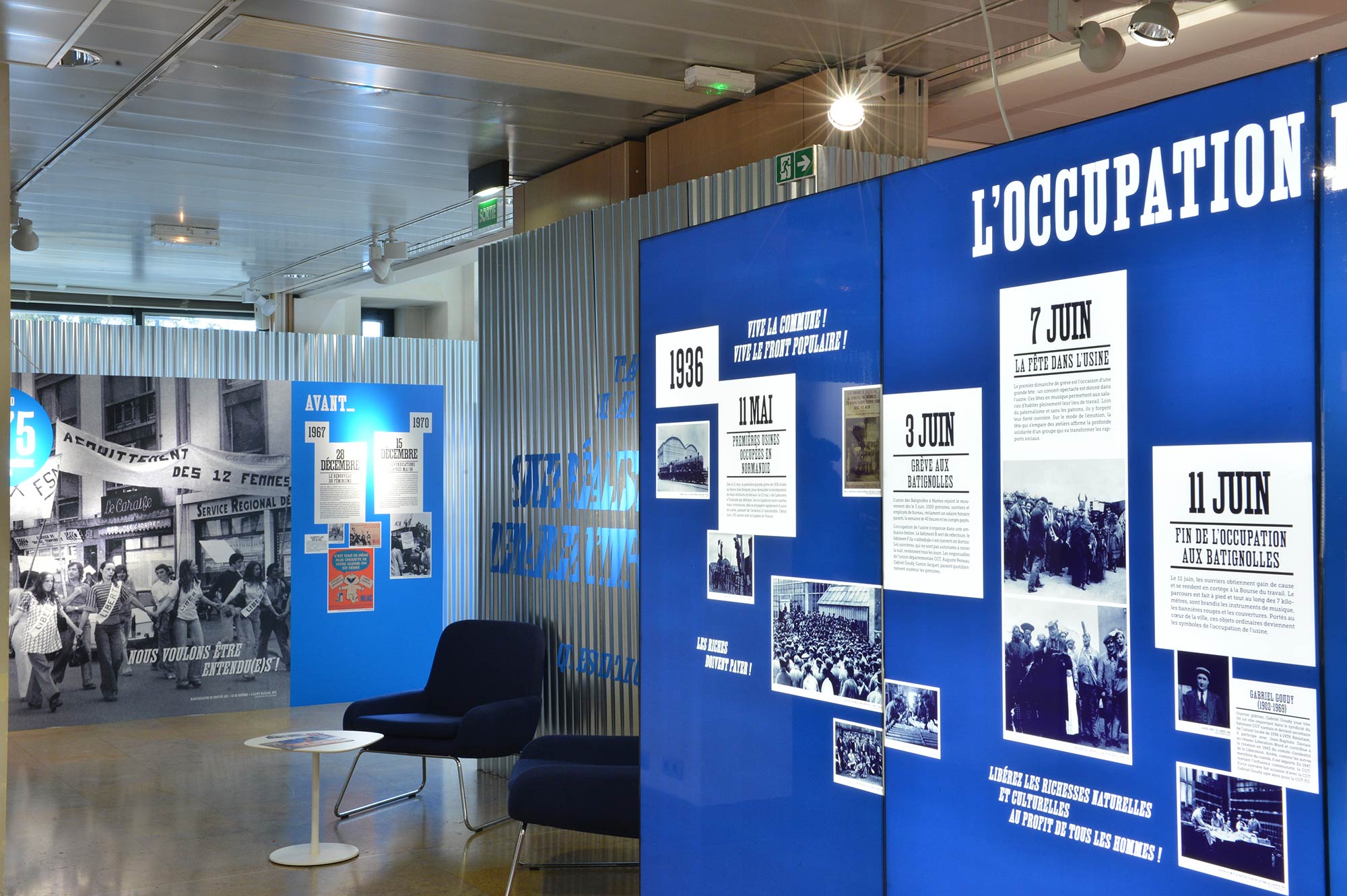 L’ambition de cette exposition était de mettre en scène cette chronologie, la séquencer et jouer sur des codes évoquant le milieu ouvrier. Une de nos attentions a été de plonger le visiteur dans une ambiance ouvrière en habillant de métal les murs de l’espace (hôtel du département) pour symboliser la froideur de leurs conditions de travail tout en les réchauffant de couleurs vives (rouge pour la révolte et bleu pour leur habit de travail).
