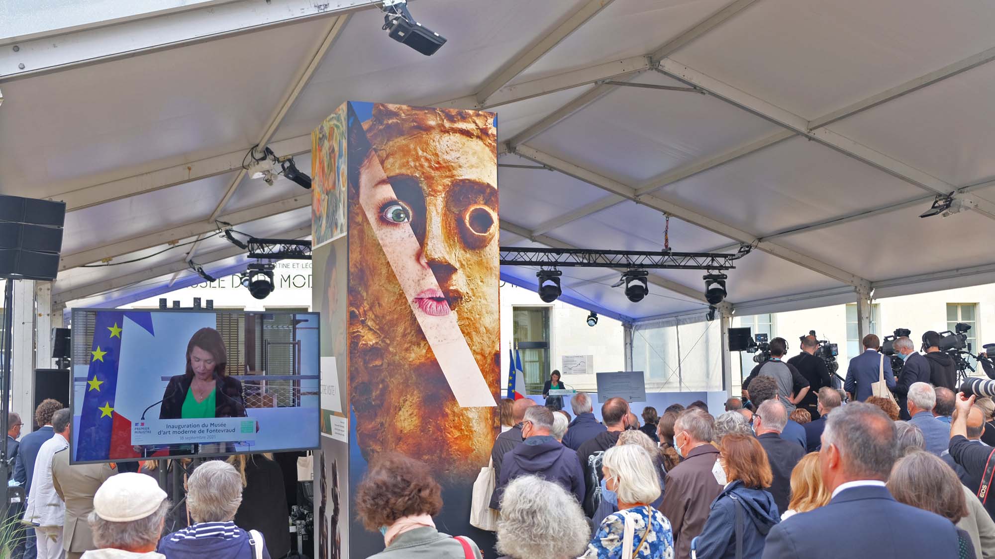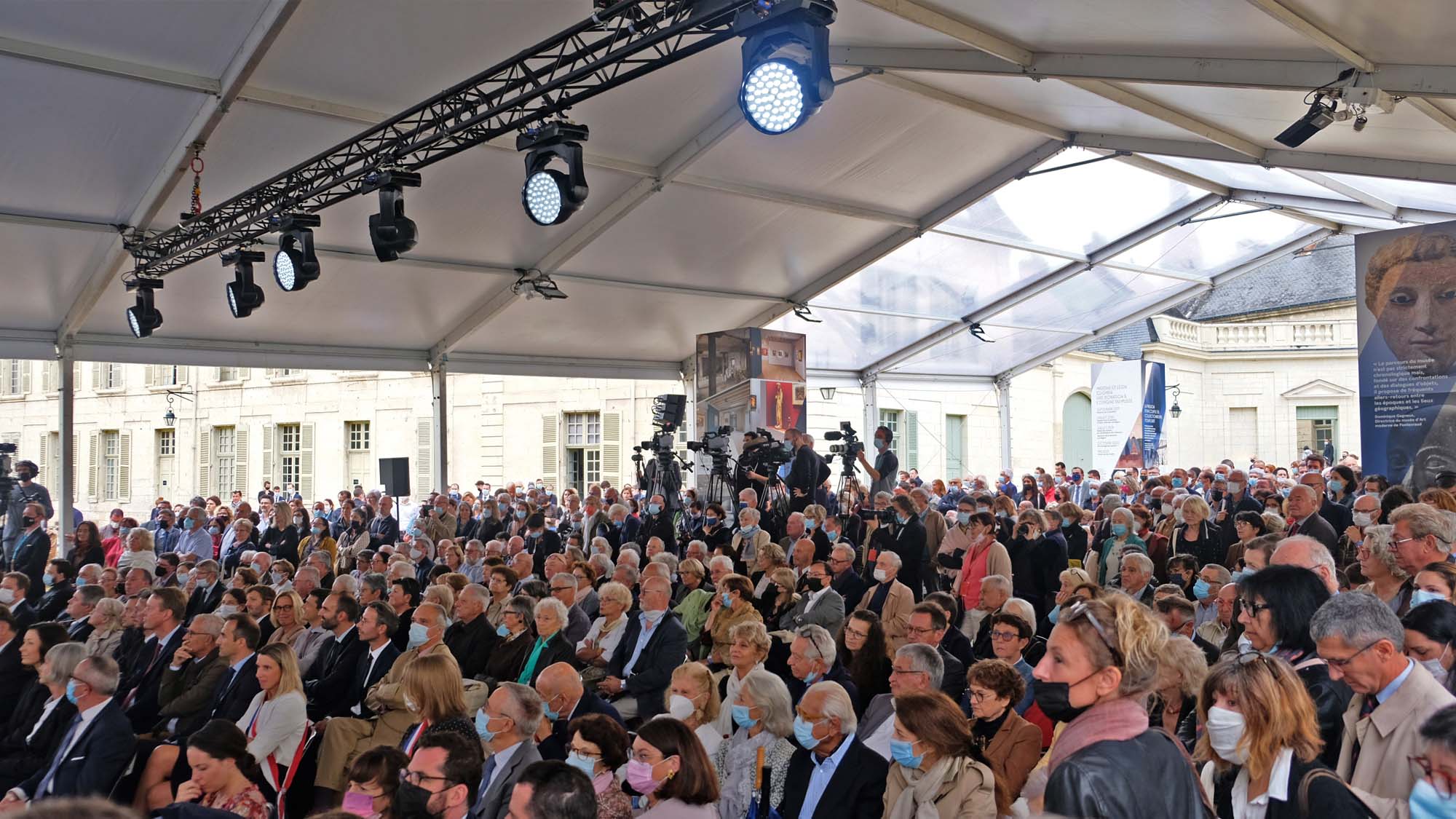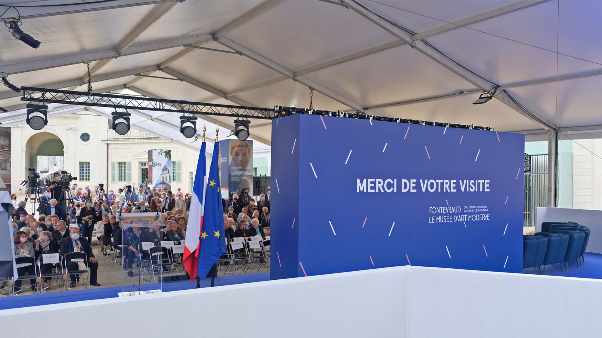 Une tente de réception de 30x15m a été montée avec un toit semi-transparent et sans parois afin de respecter au mieux le site historique et de laisser des vues sur les bâtiments du site. Au fond de celle-ci, une grande scène centrale dotée d’un écran vidéo a permis d’accueillir les invités lors de la cérémonie.