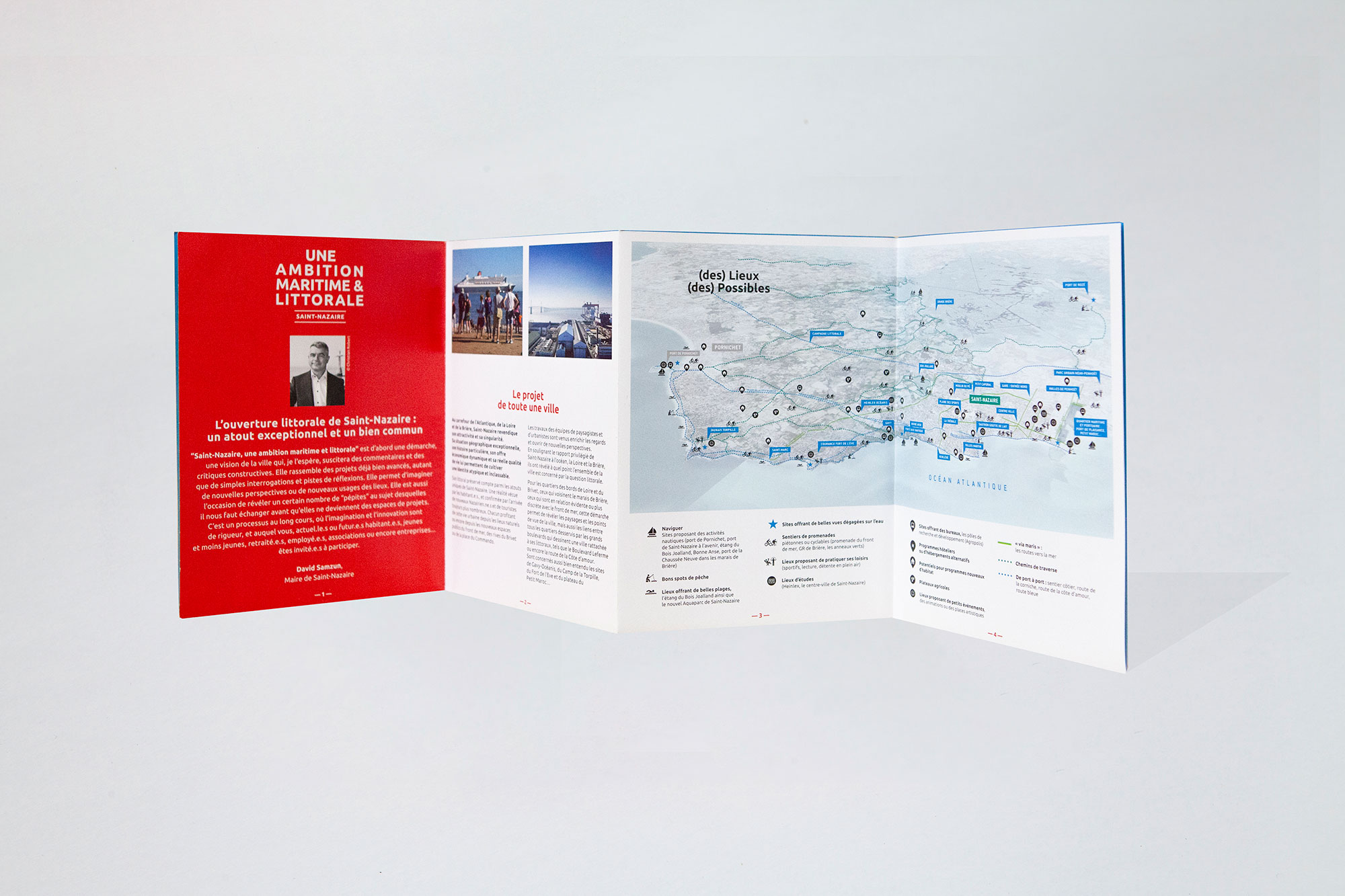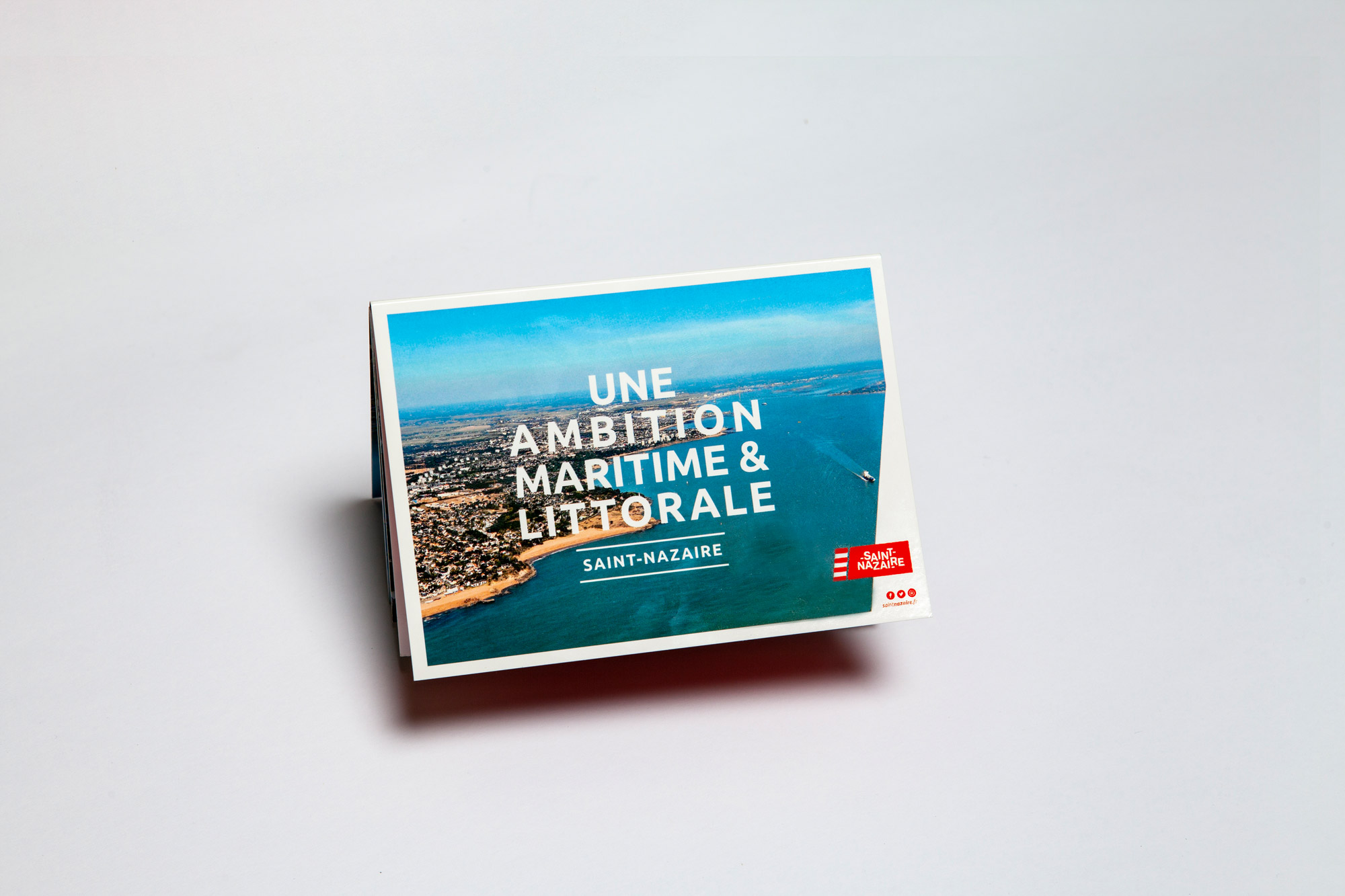 La direction communication de la Ville de Saint-Nazaire a souhaité que l’identité visuelle « Ambition Maritime / métropole Nantes – Saint-Nazaire » soit déclinée pour ses projets spécifiques ; ainsi, Anima a décliné graphiquement « Une Ambition maritime et littorale / Saint-Nazaire » en l’harmonisant aux couleurs du logotype et de la charte graphique de la Ville.